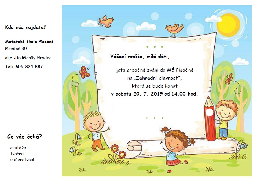 V sobotu 20. 7. 2019 se na zahradě Mateřské školy Písečné konala „Zahradní slavnost“ k příležitosti probíhajících prázdnin a také jako seznámení dětí a rodičů s novou paní ředitelkou, Mgr. Danuší Ganzwohl.